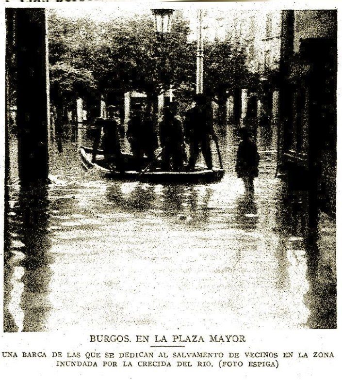 La inundación del 5 de junio de 1930 es considerada la gran tragedia del siglo XX en Burgos. A diferencia de otras riadas provocadas por el Arlanzón, esta fue causada por la falta de encauzamiento de los ríos Vena y Pico, que bajaban con una fuerza inusitada desde el este. El Ayuntamiento de Villímar llegó a telefonear a la capital para avisar de que la vega estaba totalmente anegada, pero el aviso apenas dio tiempo a reaccionar. En poco tiempo, el nivel del agua en el centro de la ciudad alcanzó en torno a los 1,78 metros de altura, una marca que todavía hoy puede verse en los pilares de los bajos del Ayuntamiento. Las imágenes de la época muestran escenas asombrosas: barcas navegando por la Plaza Mayor y la calle Santander, y caballos con el agua al cuello tirando de carros. La catástrofe causó pérdidas económicas ingentes al anegar comercios, sótanos y garajes. Un hallazgo casual de una película de 9 mm grabada por un aficionado permitió recuperar recientemente imágenes en movimiento de este desastre, mostrando a los vecinos y autoridades, como el alcalde Eloy García de Quevedo, trabajando en las labores de limpieza del lodo tras la retirada de las aguas. Este suceso fue el detonante definitivo para acometer las obras de desvío de los ríos que hoy protegen el centro urbano.