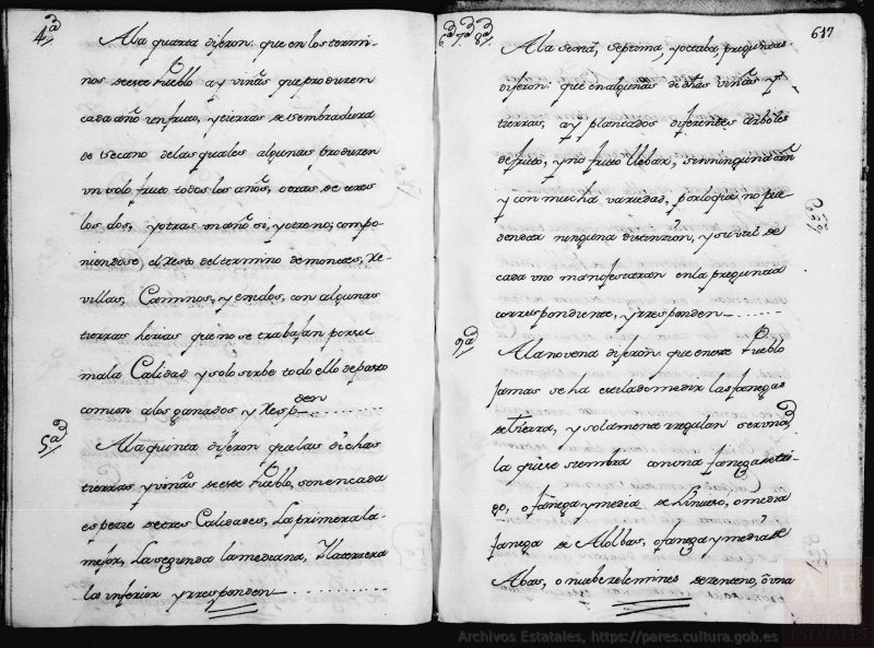 A la quarta dijeron: que en los terminos de este pueblo ay viñas que producen cada año un fruto, y tierras de sembradura de secano de las quales algunas produzen un solo fruto todos los años, otras de tres los dos, y otras un año si y otro no; componiendose el resto del termino de montes, revillas, caminos, y exidos , con algunas tierras herias que no se trabajan por su mala calidad y solo sirbe todo ello de pasto comun a los ganados y responden…