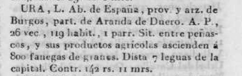 URA, L. Ab. de España, prov. y arz.de Burgos, part. de Aranda de Duero. A . P ., 26 vec., 119 habit., 1 parr. Sit. entre peñascos, y sus productos agrícolas ascienden á 800 fanegas de granos. Dista 7 leguas de la capital. Contr. 142 rs. 11 mrs. https://bibliotecadigital.jcyl.es/es/catalogo_imagenes/grupo.do?path=10066096