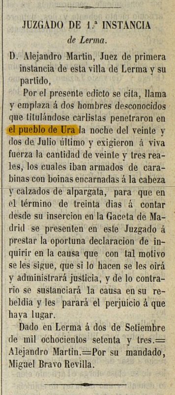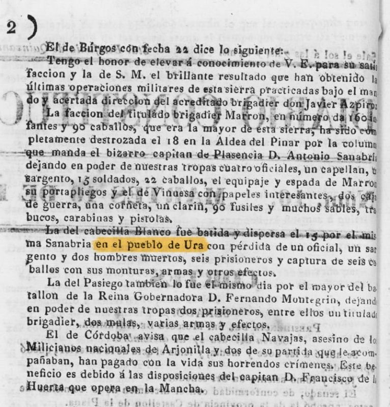 Una comunicación publicada el 16 de enero de 1838 recoge oficialmente los resultados de las operaciones militares desarrolladas en la sierra burgalesa bajo el mando del brigadier Javier Azpiroz. En ella se informa de la derrota de varias facciones carlistas, entre ellas la del cabecilla Blanco, batida en Ura el 15 de diciembre de 1837 por fuerzas al mando del capitán Antonio Sanabria. El texto decía: El de Burgos con fecha 22 dice lo siguiente: Tengo el honor de elevar á conocimiento de V. E. para su satisfaccion y la de S. M. el brillante resultado que han obtenido la faccion y las últimas operaciones militares de esta sierra practicadas bajo el mando y acertada direccion del acreditado brigadier don Javier Azpiroz. La faccion del titulado brigadier Marron (...) ha sido completamente destrozada (...) La del cabecilla Blanco fue batida y dispersa el 15 por el mismo Sanabria <b>en el pueblo de Ura</b> con pérdida de un oficial, un sargento y dos hombres muertos, seis prisioneros y captura de seis caballos con sus monturas, armas y otros efectos. La del Pasiego tambien lo fue el mismo dia (...) La noticia confirma que Ura fue escenario directo de una acción militar durante la Primera Guerra Carlista, integrada en una operación más amplia de persecución de partidas en la sierra. Diario constitucional de Palma de Mallorca: Número 16 - 1838 enero 16 https://prensahistorica.mcu.es/es/catalogo_imagenes/grupo.do?path=546342&posicion=2&presentacion=pagina ------ Yo recuerdo que de pequeño me hablaban en Ura de una canción que existió sobre una guerra que hubo a la entrada del Carrascal (un monte de Ura) donde hubo muchos muertos. Pero nadie recordaba la letra. ¿Esta noticia tendrá relación con esto?