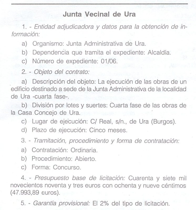 Un anuncio de la Diputación de Burgos dice: En cuanto a la actualización de precios, se fija en 2.403.945 pesetas el proyecto de puente sobre el río Mataviejas en Ura.