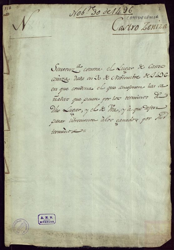 Sentencia contra el Lugar de Castroceniza dada en 30 de Noviembre de 1496 en que condena el que amojonen las cañadas que pasan por los términos de dicho lugar y el de Ura, y a que dejen pasar libremente a los ganados por sus términos. https://pares.mcu.es/ParesBusquedas20/catalogo/description/5260870?nm