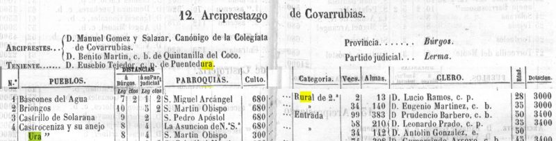 Ura, lugar con ayuntamiento en la provincia, audiencia territorial, ciudad gótica y diócesis de Burgos, a 7 leguas; partido judicial de Lerma, a 3 ¼. Situado al pie de la cordillera de riscos cortados que forma el valle por el cual corre, bañando la población, el río Mataviejas. Goza de buena ventilación y de clima frío, pero sano; las enfermedades más comunes son fiebres intermitentes. Tiene 21 casas, escuela de instrucción primaria, y una iglesia parroquial dedicada a San Martín, servida por un cura párroco. Confina el término al Norte con Puentedura; al Este, Retuerta; al Sur, Cebrecos y Castroceniza; y al Oeste, Tordueles, Puentedura y Cebrecos. El terreno es de mediana calidad; la parte montuosa está poblada de encinas, robles y mata baja; lo fertiliza el río mencionado. Los caminos son vecinales. Producción: cereales, legumbres y frutas. Ganadería: lanar, vacuno y cabrío; caza mayor y menor, y pesca de barbos y truchas. Población: 19 vecinos, 70 almas. Capital productivo: 52.800 reales. Impuesto: 5.271 reales. Contribución: 449 reales y 32 maravedíes.