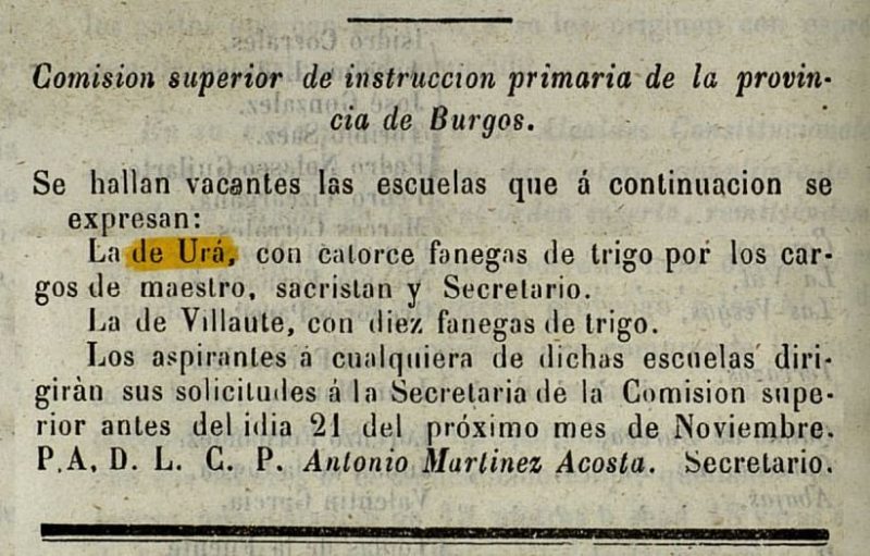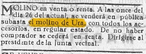 Se pone en conocimiento de todos los interesados que el próximo día nueve de Julio a las 5 de la tarde, en la plaza de Ura se sacará a pública subasta por el sistema de puja a la llana la Casa del Cura. Su precio de salida es: 550.000 ptas.