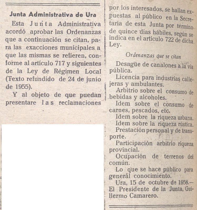 Presidente de la Junta de Ura, 200 pesetas. Junta administrativa de Ura, 200. Boletín oficial de la provincia de Burgos: Número 151 - 7 julio 1965