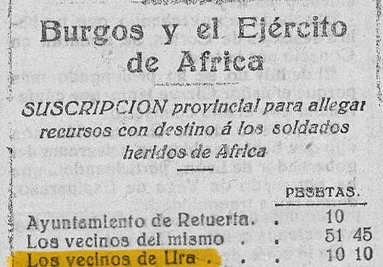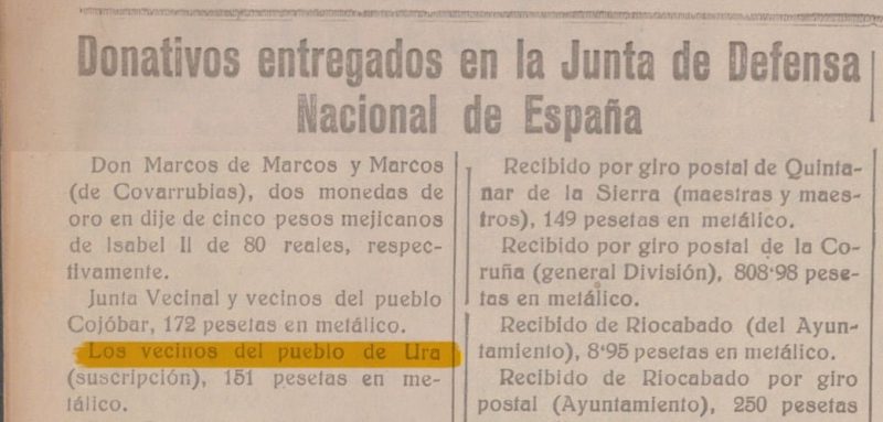 Donativos entregados en la Junta de Defensa Nacional de España: Los vecinos del pueblo de Ura (suscripción), 151 pesetas en metálico.