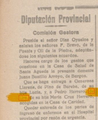 Diputación Provincial de Burgos. Comisión Gestora acuerda que se haga entrega a Pedro Herrero, de Ura, de su hija María Cruz Herrero, acogida en la Casa de Caridad.