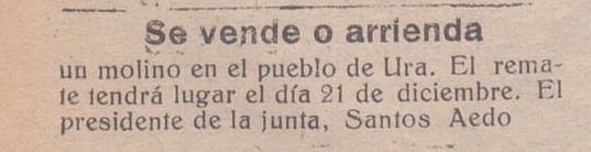 El día 30 del actual se arrendará bajo subasta el molino de Ura con dos molares en buen uso, buen salto de agua autorizado para moler trigo y pienso. Dirigirse al alcalde de dicho pueblo.