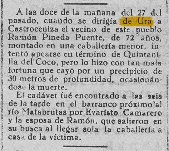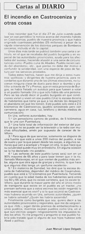 La carta fue enviada por Juan Manuel López Delgado, que después sería Alcalde pedáneo de Ura. Creo recordar que fue el día 27 de Julio cuando pude leer en ese periódico la noticia acerca del incendio habido en Castroceniza, pueblo de nuestra provincia y que había originado cuantiosas pérdidas (25 millones) a pesar de la rápida intervención de los distintos parques de Bomberos cercanos, incluido el de la capital. Unos días más tarde se publicó también una carta o artículo, en el que se recababa del pueblo burgalés y en especial de las autoridades provinciales, ayuda para los afectados del suceso, haciendo alusión a una serie de circunstancias como «Pueblo cuna de Abades. Pueblo recién salido del abandono», etc., que pienso no debe dar motivo a confundir la solidaridad, con una especie de paso de factura por los servicios prestados. Todos estos hechos, hacen que me dirija a estos nuestros «políticos» y dirigentes de nuestra provincia, para recordarles que durante una de las últimas elecciones, no tu- vieron ninguna clase de duelo para decir a «bombo y platillo» a través de TV y Prensa, que en esta provincia de Burgos, se había fletado un autobús para que fuesen a votar a un pueblo llamado Ura y que sólo había ido una persona. Pero se les olvidó decir al pueblo burgalés en qué condiciones vivían y viven en ese pueblo (Ura) la escasa docena de habitantes que tiene ya que a los demás les despachó el abandono en que les tienen. Este pueblo sólo está a 2,5 kilómetros de Castroceniza, (pueblo siniestrado pero con carretera, agua en casa, luz, teléfono y demás medios de comunicación). En Ura, señores autoridades, hay: 1.° Un penosísimo camino de piedras, de 5 kilómetros que le une con Puentedura. 2.° Una falta total de información del exterior del pueblo ya que no se puede ver la televisión y la radio con muchas dificultades, amén por supuesto de carecer de teléfono. 3.° Para agua de que servirse, solamente se dispone de una fuente que e s t áa unos 200 metros del pueblo, a ras de suelo y por la que pasan desde las ovejas, a algunos señores que van a acampar y friegan en ella, lo que hace que su salubridad quede muy en entredicho. En alguna ocasión se la ha declarado «no potable». 4.° Las señoras de este pueblo (unas seis) son en un 90% mayores de 65 años y para lavar tienen que ir la río, llamado Mataviejas, en el que vierten de pueblos más arriba, alguna que otra agua de granjas y molino, lo que hace que algunos días tenga un «perfume excelente». 5.° En materia de Sanidad, les diré que la escasa docena de habitantes, dependen del médico de Covarrubias, pueblo que está a 12 kilómetros por Puentedura. Teniendo en cuenta que la edad media de los habitantes será entre los 60 y 65 años, que no existe carretera, que no existe teléfono, que durante la mayor parte del año el único medio de transporte que existe en el pueblo es un tractor, ¿no piensan señores que a estos vecinos les están negando lo más esencial que es vivir? y si lo que ocurrió en Castroceniza hubiera ocurrido en Ura, señores autoridades, ¿quién se habría salvado? ¿Quién les habría socorrido?. Finalmente como burgalés que soy, quiero decir a las autoridades provinciales y regionales, que me da vergüenza que «Vds.», sigan dando premios de embellecimiento a unos pueblos, mientras existan pueblos como Ura, en el que sus vecinos «pagan» religiosamente los impuestos todos los años. Yo me pregunto y pregunto si ese pueblo habría sido tratado igual si alguno de sus hijos hubiese sido Abad o político.
