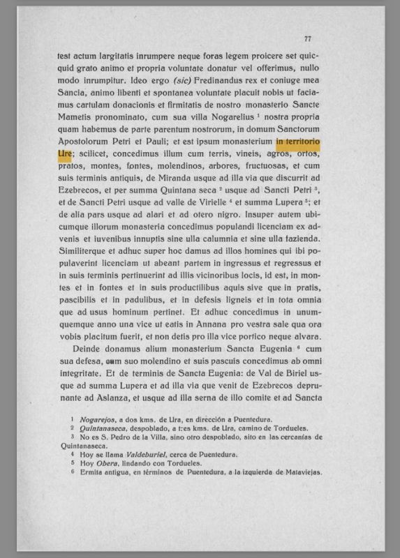 Entre ellas aparece una referencia directa al territorio de Ura con la fórmula latina: “et in alfoz de Ura, Enezebrecos, et in Maluca suas divisas cum suas hereditates”. Con esta expresión se indicaba la existencia de posesiones situadas dentro del alfoz de Ura, concretamente en los lugares denominados Enezebrecos y Maluca, cuyos límites y heredades quedaban también incluidos en la donación.