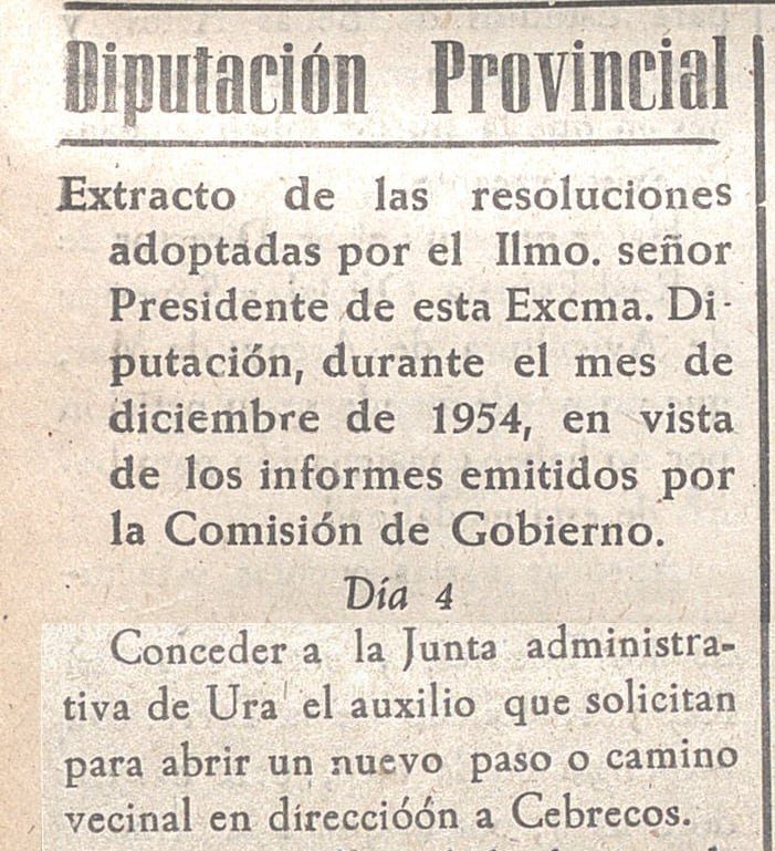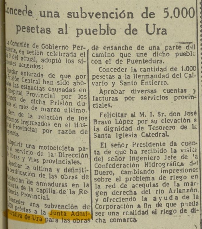 La Diputación Provincial de Burgos concede una subvención de 5.000 pesetas al pueblo de Ura para las obras de ensanche de una parte del camino que une dicho pueblo con el de Puentedura.