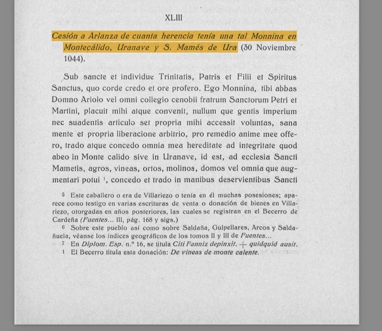 Yo, Monnina, a ti, el abad don Auriolo, y a toda la comunidad del cenobio de los hermanos de los santos Pedro y Martín, me ha parecido bien y así lo he acordado; sin que me haya compelido poder alguno de gente ni por instigación de nadie, sino por mi propia voluntad, con mente sana y por libre decisión de mi albedrío, para remedio de mi alma, ofrezco, entrego y concedo toda mi heredad, íntegra, que tengo en Montecálido o en Uranave, esto es, junto a la iglesia de San Mamés: campos, viñas, huertos, molinos, casas, y todo cuanto pude aumentar; lo concedo y lo entrego en manos de quienes sirven a San Pedro y a San Martín, tanto en vida mía como después de mi muerte; y todo lo que de ello quisiereis hacer, en nombre de Dios, tengáis potestad, de modo que nadie se atreva a inquietaros por ello.