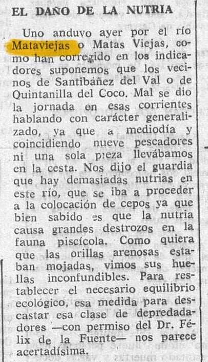 En una noticia referente a la pesca se informa que van a poner cepos en el río Mataviejas para acabar con las nutrias, pues "causan grandes destrozos en la fauna piscícola". Con la osadía de mencionar a Félix Rodríguez de la Fuente.