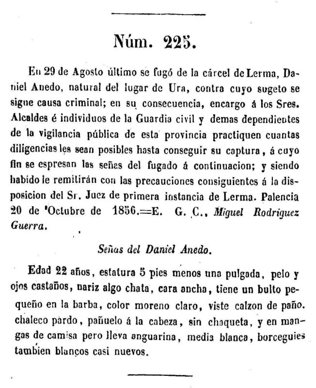 En 29 de Agosto último se fugó de la cárcel de Lerma, Daniel Ahedo, natural del lugar de Ura, contra cuyo sugeto se sigue causa criminal;