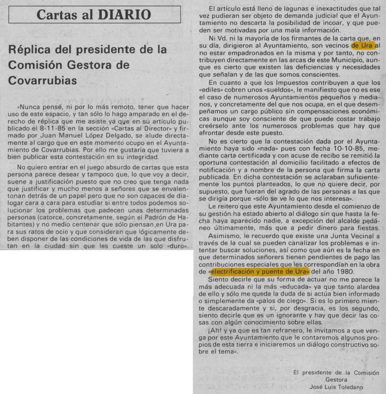 En noviembre de 1985 el presidente de la Comisión Gestora de Covarrubias publicó una réplica a una carta firmada por vecinos vinculados a Ura. En ella se abordaban críticas municipales y se recordaba la existencia de deudas pendientes derivadas de obras ejecutadas en 1980. El texto señalaba: (…) determinados señores tienen pendientes de pago las contribuciones especiales que les correspondían en la obra de electrificación y puente de Ura del año 1980. La réplica también indicaba que los firmantes no estaban empadronados en el municipio y mencionaba la existencia de una Junta Vecinal como vía institucional para canalizar problemas. El episodio documenta la ejecución de infraestructuras básicas en 1980 y las tensiones económicas derivadas en un contexto de fuerte despoblación. https://prensahistorica.mcu.es/es/catalogo_imagenes/grupo.do?path=1000470421&posicion=3&presentacion=pagina Diario de Burgos : de avisos y noticias: Número 28974 - 1985 noviembre 14