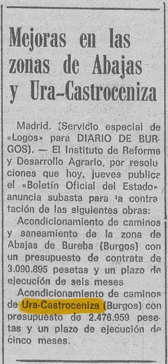 El instituto de Reforma y Desarrollo Agrario publica el "Boletín Oficial del Estado" anuncia subasta para la contratación de las siguientes obras: Acondicionamiento de caminos de Ura-Castroceniza con presupuesto de 2.476.959 pesetas (...)