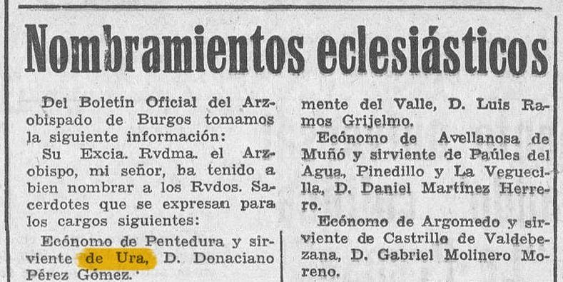 Nombramientos eclesiásticos. Su Excia. Rvdma. el Arzobispo, mi señor, ha tenido a bien nombrar a los Rudos. Sacerdotes que se expresan para los cargos siguientes: Ecónomo de Puentedura y sirviendo de Ura, D. Donaciano Pérez Gómez.