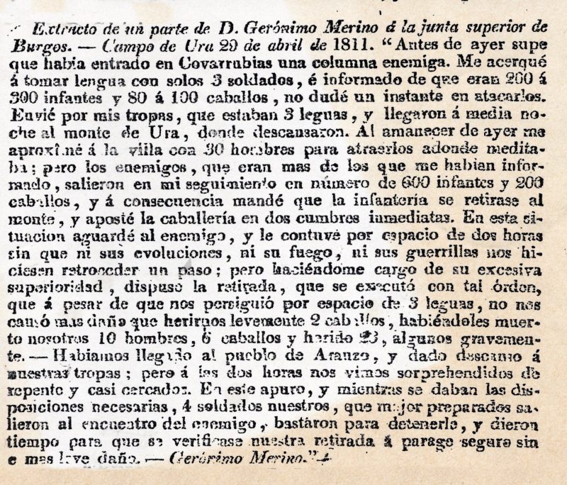 Extracto de un parte de D. Gerónimo Merino a la junta superior de Burgos.-- Campo de Ura 29 de abril de 1811. "Antes de ayer supe que había entrado en Covarrubias una columna enemiga. Me acerqué á tomar lengua con solos 3 soldados, é informado de que eran 200 á 300 infantes y 80 á 100 caballos, no dudé un instante en atacarlos. Envié por mis tropas, que estaban 3 leguas, y llegaron á media noche al monte de Ura, donde descansaron. Al amanecer de ayer me aproximé á la villa con 30 hombres para atraerlos adonde meditaba; pero los enemigos, que eran mas de los que me habian infomado, salieron en mi seguimiento en número de 600 infantes y 200 caballos, y á consecuencia mandé que la infantería se retirase al monte, y aposté la caballería en dos cumbres inmediatas. En esta situación aguardé al enemigo, y le contuve por espacio de dos horas sin que ni sus evoluciones, ni su fuego, ni sus guerrillas nos hiciesen retroceder un paso; pero haciéndome cargo de su excesiva superioridad, dispuse la retirada, que se executó con tal órden, que á pesar de que nos persiguió por espacio de 3 leguas, no nos causó mas daño que herirnos levemente 2 caballos, habiéndoles muerto nosotros 10 hombres, 6 caballos y herido 23, algunos gravemente. - - Habiamos llegado al pueblo de Arauzo, y dado descanso á nuestras tropas; pero á los dos horas nos vimos sorprehendidos de repente y casi cercados. En este apuro, y mientras se daban las disposiciones necesarias, 4 soldados nuestros, que mejor preparados salieron al encuentro del enemigo, bastaron para detenerlo, y dieron tiempo para que se verificase nuestra retirada a parage seguro sin el mas leve daño. - - Gerónimo Merino." Esta información me la pasó Diego Peña, de Lerma, que la encontró en la Biblioteca Nacional en sus pesquisas sobre el cura Merino.