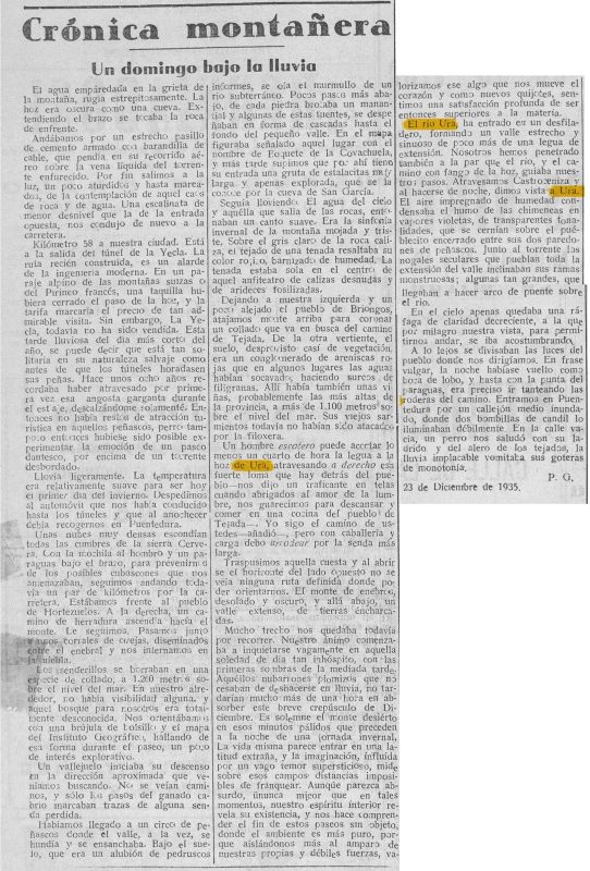 El 23 de diciembre de 1935, pocos meses antes del inicio de la Guerra Civil, una crónica titulada “Un domingo bajo la lluvia” describía una excursión por la sierra y el valle del río Ura. El texto recoge la hoz, el desfiladero y la visión del pueblo al anochecer, ofreciendo una imagen paisajística anterior al conflicto de 1936. La crónica decía: Un hombre escéptico puede acortar lo menos un cuarto de hora la legua a <b>la hoz de Ura</b>, atravesando á derecho esa fuerte loma que hay detrás del pueblo —nos dijo un tratante en telas cuando abrigados al amor de la lumbre, nos guarecimos para descansar y comer en una cocina del pueblo de Tejada—. Yo sigo el camino de ustedes —añadió—, pero con caballería y carga debo atajar por la senda más larga. <b>El río Ura</b> ha entrado en un desfiladero, formando un valle estrecho y sinuoso de poco más de una legua de extensión. Nosotros hemos bordeado también a la par que el río, y el camino con fango de la hoz, guiaba nuestros pasos. Atravesamos Castroceniza y al hacerse de noche, dimos vista a <b>Ura</b>. El aire impregnado de humedad condensaba el humo de las chimeneas en vapores violetas, de transparentes tonalidades, que se cernían sobre el pueblecito encuadrado entre sus dos paredones de peñascos. Junto al torrente los nogales seculares que pueblan toda la extensión del valle inclinaban sus ramas monstruosas; algunas tan grandes, que llegaban a hacer arco de puente sobre el río. <u>ANOTACIÓN</u> El artículo constituye un testimonio literario y paisajístico de Ura en vísperas de la Guerra Civil, cuando el valle era percibido como enclave agreste, húmedo y encajado entre peñascos. Narración publicada el 1 de enero de 1936 en Diario de Burgos https://prensahistorica.mcu.es/es/catalogo_imagenes/grupo.do?path=1000447430&posicion=6&presentacion=pagina