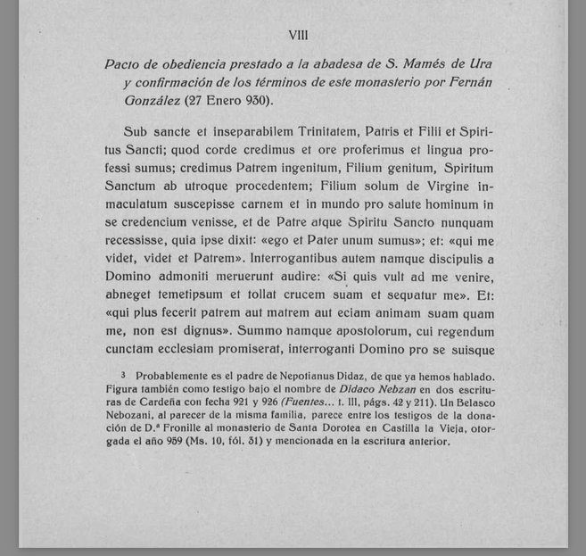 En el nombre de Cristo, yo, Fernán González, junto con mi esposa Sancha, por remedio de nuestras almas y de las de nuestros padres, concedemos en el atrio de San Mamés y a Dios, y a los que allí sirven, la iglesia llamada de Santa Eugenia virgen y de Santa María virgen, con edificios, tierras, viñas, huertos, manzanales y pastos, y con todas sus prestaciones, para que desde ahora podáis hacer de ello lo que queráis en nombre de Cristo.