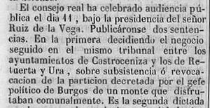 El consejo real ha celebrado audiencia pública el día 11 [...] decidiendo el negocio seguido entre los ayuntamientos de Castroceniza y los de Retuerta y Ura sobre subsistencia o revocación [...] del monte que disfrutaban comunalmente