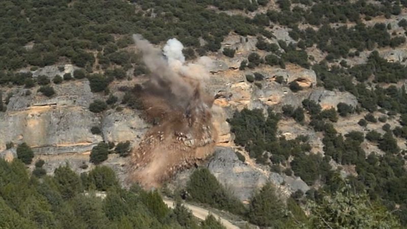 Desde hacía unos meses, los vecinos habían detectado una notable grieta en un gran bloque de roca conglomerado, pudiendo apreciarse que la franja de arcilla sobre la que este bloque se sustentaba, estaba empezando a reventarse, fruto de la presión que estaba soportando. El desprendimiento incontrolado de este bloque hubiera provocado la destrucción de un tramo de la única carretera que da acceso al pueblo. Fotografía por Alfonso Cavia.