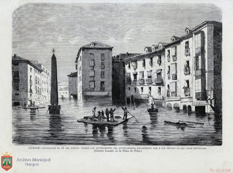 El desbordamiento del río Arlanzón en junio de 1874 se convirtió en una de las mayores catástrofes naturales de Burgos. Las aguas anegaron gran parte del centro urbano, causando daños materiales incalculables.