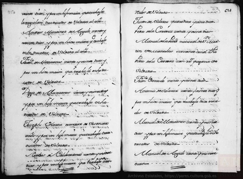 Matthias de Varredo ziento y veinte días, y por un hijo maior que trabaja le rregulan diez ducados de soldada al año; Andres Martinez de Angulo ziento y veinte dias y por un hixo maior que trabaja ocho ducados de soldada al año; Fráncisco de Manzanos ziento y veinte dias y por un hijo mayor que trabaja ocho ducados de Soldada; Diego de Manzanos ziento y veinte días y por un hijo maior que trabaja ocho ducados de Soldada; Joseph Hortiz es maior de sesenta años y por un hijo maior que trabaja treze ducados de Soldada; Nicolas de Valderrama ziento y veinte dias y por un hijo maior que trabaja zien reales de soldada; Juan de Salazar quarenta y zinco días; Pedro de la Carrera ziento y veinte días; Manuel de la Peña natural de S Martin de Mancobos sirviente con el dicho Pedro de la Carrera zien reales que gana de Soldada; Fráncisco Varredo ziento y veinte días; Antonio de Salazar ziento y veinte dias y por un hixo maior que trabaja doze ducados de soldada; Manuel de Manzanos ziento y veinte dias y por un hijo maior que trabaja ocho ducados de Soldada; Manuel de Angulo ziento y veinte días; Francisco Gomez lo mismo; Antonio de Extremiana lo mismo; Matheo Hortiz lo mismo; Pedro Velez lo mismo; Domingo Gonzalez lo mismo; Martin Ruiz de Riofrancos los mismo; Manuel Ruiz de Riofrancos lo mismo; Juan Ruiz de Riofrancos los mismo; Juan de Cauvilla los mismo; Santiago del Castillo los mismo; Julian de Tobalina los mismo; Thoribio de Angulo lo mismo; Pedro Gonzalez lo mismo; Simon de Corcuera lo mismo; Domingo Varredo lo mismo; Martin de Manzanos lo mismo; Juan del Castillo lo mismo; Domingo Ruiz lo mismo; Juan de la Cantera lo mismo; Miguel de Corcuera lo mismo; y responden…