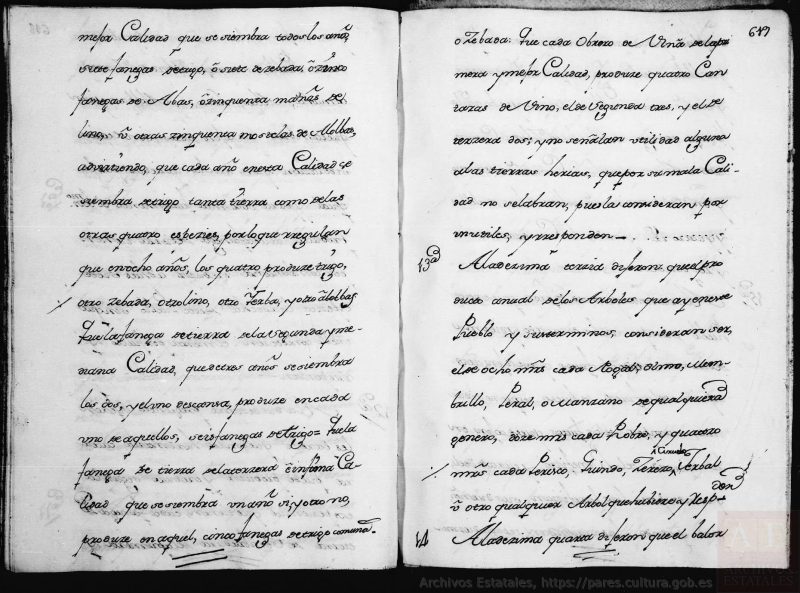 otro zebada, otro lino, otro Yerba, y otro álolbas. Que la fanega de tierra de la segunda y mediana Calidad, que de tres años se siembra los dos, y el uno descansa, produce encada uno de aquellos, seis fanegas de trigo- que la fanega de tierra de la terzera è infima Calidad que se siembra un año si, y otro no,