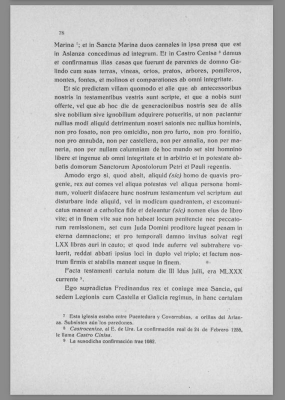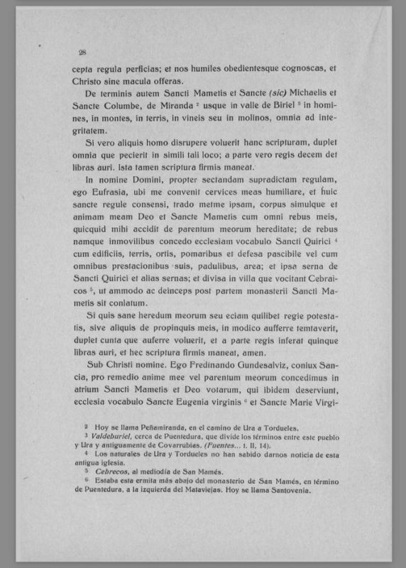 En el nombre de Cristo, yo, Fernán González, junto con mi esposa Sancha, por remedio de nuestras almas y de las de nuestros padres, concedemos en el atrio de San Mamés y a Dios, y a los que allí sirven, la iglesia llamada de Santa Eugenia virgen y de Santa María virgen, con edificios, tierras, viñas, huertos, manzanales y pastos, y con todas sus prestaciones, para que desde ahora podáis hacer de ello lo que queráis en nombre de Cristo.