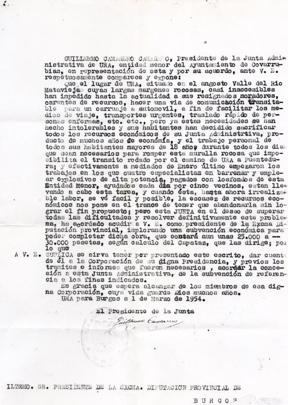 GUILLERMO CAMARERO CAMARERO, Presidente de la Junta Administrativa de URA, entidad menor del Ayuntamiento de Covarrubias,en representación de esta y por su acuerdo, ante V. E. respetuosamente comparece y expone: Que el lugar de URA, situado en el angosto Valle del Rio Mataviejas. cuyas largas margenes rocosas, casi inaccesibles han impedido hasta la actualidad a sus resignados moradores, carentes de recursos, hacer una vía de comunicación transitable para un carruaje a automovil, a fin de facilitar los medios de viaje, transportes urgentes, traslado rápido de personas enfermas, etc. etc., pero ya estas necesidades se han hecho intolerables y sus habitantes han decidido sacrificar todos los recursos económicos de su Junta Administrativa, producto de muchos años de economía y el trabajo personal de todos sus habitantes mayores de 18 años durante todos los dias que sean necesarios para romper esta muralla rocosa que imposibilita el transito rodado por el camino de URA a Puentedura; y efectivamente a mediados de Enero úItimo empezaron los trabajos en los que cuatro especialistas en barrenar y empler explosivos de alta potencia, pagados con los fondos de esta Entidad Menor, ayudados cada dia por cinco vecinos, están llevando a cabo esta tarea, y cuando ésta, hasta ahora irrealizable labor, se vé facil y posible, la escasez de recursos económicos nos pone en el trance de tener que abandonarla sin lograr el fin propuesto; pero esta JUNTA en el deseo de superar todas las dificultades y resolver definitivamente este problema, ha acoordado acudir a V. E. como presidente de le Excma Diputación provincial, implorando una subvención económica para poder completar dicha obra ,que costará aún unas 25.000 a 30.000 pesetas, según calculo del Capataz, que las dirige; por lo que A V. E. SUPLICA se sirva toner por presentado este escrito, dar cuenta de él a la Corporación de su digna Presidencia, y previos los tramites e informes que fueran necesarios, acordar la concesión a esta Junta Administrativa, de la subvención de referencia a los fines indicados. Es gracia que espera alcanzar de los miembros de esa digna Corporación, cuya vida guarde Dios muchos años. URA para Burgos a 1 de Marzo de 1954. El Presidente de la Junta. Guillermo Camarero ILTRMO. SR. PRESIDENTE DE LA EXCMA. DIPUTACIÓN PROVINCIAL DE BURGOS <u>ANOTACIÓN</u> Hasta ese momento, en el Morro de San Pelayo solo había una senda a la derecha de la actual carretera –según se sale de Ura–, y un mal camino que bordeaba todo el espigón del Morro por la izquierda, entre las carrascas y enebros (aún se intuye). Hubo una respuesta inmediata de la Diputación y del Gobierno, dando dinero y recursos para ejecutar la obra del camino.