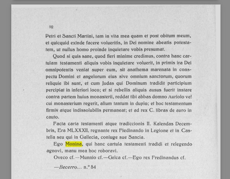 Yo, Monnina, a ti, el abad don Auriolo, y a toda la comunidad del cenobio de los hermanos de los santos Pedro y Martín, me ha parecido bien y así lo he acordado; sin que me haya compelido poder alguno de gente ni por instigación de nadie, sino por mi propia voluntad, con mente sana y por libre decisión de mi albedrío, para remedio de mi alma, ofrezco, entrego y concedo toda mi heredad, íntegra, que tengo en Montecálido o en Uranave, esto es, junto a la iglesia de San Mamés: campos, viñas, huertos, molinos, casas, y todo cuanto pude aumentar; lo concedo y lo entrego en manos de quienes sirven a San Pedro y a San Martín, tanto en vida mía como después de mi muerte; y todo lo que de ello quisiereis hacer, en nombre de Dios, tengáis potestad, de modo que nadie se atreva a inquietaros por ello.