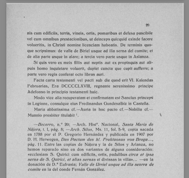 Y determinamos sus límites: desde el valle de Birel hasta la Serna del conde; y por otra parte hasta el alar; y por la tercera parte hasta Aslanza.