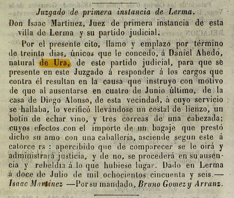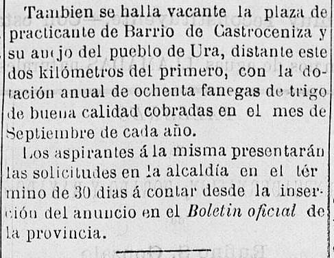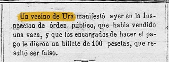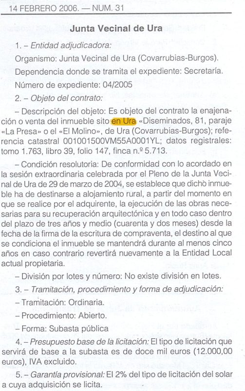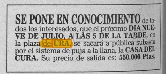 Se pone en conocimiento de todos los interesados que el próximo día nueve de Julio a las 5 de la tarde, en la plaza de Ura se sacará a pública subasta por el sistema de puja a la llana la Casa del Cura. Su precio de salida es: 550.000 ptas.