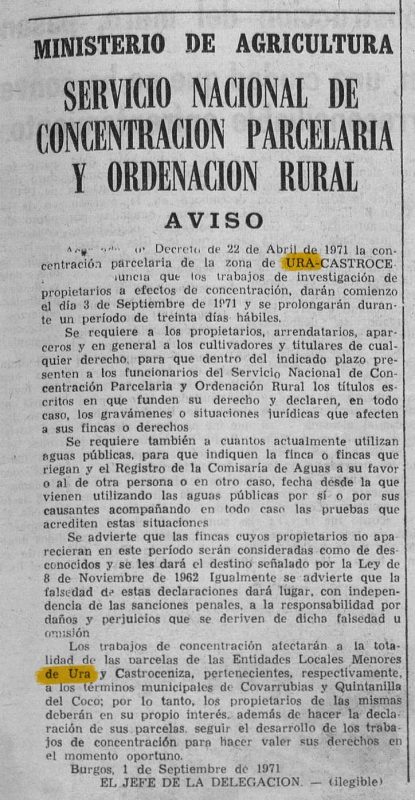 Por Decreto de 22 de abril de 1971, el Ministerio de Agricultura declaró la concentración parcelaria de la zona Ura–Castroceniza. Los trabajos de investigación de propietarios comenzaron el 3 de septiembre de 1971. El aviso oficial señalaba: Decreto de 22 de Abril de 1971 la concentración parcelaria de la zona de URA-CASTROCE... Los trabajos de concentración afectarán a la totalidad de las parcelas de las Entidades Locales Menores de Ura y Castroceniza, pertenecientes, respectivamente, a los términos municipales de Covarrubias y Quintanilla del Coco… Se requería a propietarios y cultivadores presentar títulos y declarar cargas, iniciándose un proceso de reorganización completa del parcelario. La concentración parcelaria supuso una transformación significativa del paisaje agrario tradicional, alterando lindes históricas y reorganizando la propiedad rural. https://prensahistorica.mcu.es/es/catalogo_imagenes/grupo.do?path=1000458367&posicion=17&presentacion=pagina