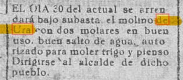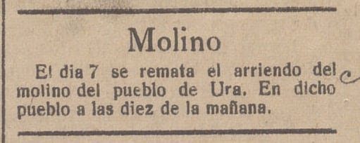 El día 30 del actual se arrendará bajo subasta el molino de Ura con dos molares en buen uso, buen salto de agua autorizado para moler trigo y pienso. Dirigirse al alcalde de dicho pueblo.