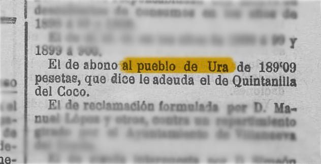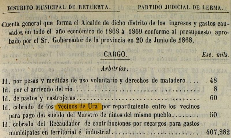 El 8 de diciembre de 1470, en Segovia, Enrique IV de Castilla otorgó un privilegio por el que confirmaba al Monasterio de San Jerónimo de Espeja un juro de heredad de 27.000 maravedíes anuales, previamente cedido por Juan de Briones, criado del rey. Esto no significa que Ura tuviese que pagar a ese monasterio, sino que la parte del diezmo que correspondía a la Corona —las tercias reales— fue asignada por el rey al monasterio, que pasó a percibir esa renta en su lugar. Así, la renta quedaba situada sobre diversas tercias reales (dos novenos del diezmo que correspondían a la Corona). En el bloque que “andan en renta con el arcedianadgo de Palençuela”, el documento detalla literalmente: “de las dichas tercias de Sant Pedro de Mercadillo los dichos mill mrs.; e de las dichas tercias de Tajada los dichos tres mill mrs., e de las dichas tercias de Briongos los dichos trezientos mrs., e de las dichas tercias de Retuerta los dichos dos mill mrs., e de las dichas tercias de Tordeheles los dichos mill mrs., e de las dichas tercias de Rabe los dichos dos mill mrs., e de las dichas tercias de Castrozeniza los dichos trezientos mrs., e de las dichas tercias de Ura los dichos quatrocientos mrs., que son los dichos diez mill mrs.” En este reparto, Ura aporta 400 maravedíes, lo que representa aproximadamente el 4 % del total del bloque (10.000 mrs). La comparación muestra su posición económica relativa: Tajada: 3.000 mrs (30 %) Retuerta: 2.000 mrs (20 %) Rabe: 2.000 mrs (20 %) San Pedro de Mercadillo: 1.000 mrs (10 %) Tordeheles: 1.000 mrs (10 %) Ura: 400 mrs (4 %) Briongos: 300 mrs (3 %) Castroceniza: 300 mrs (3 %) Si las tercias equivalían a 2/9 del diezmo, esos 400 maravedíes implican —como orden de magnitud— un diezmo valorado en torno a 1.800 maravedíes y una producción anual estimable cercana a 18.000 maravedíes. La referencia es estrictamente fiscal, pero su valor histórico es claro: en 1470 Ura aparece como núcleo productivo activo, con diezmo tasado y plenamente integrado en la red tributaria y eclesiástica castellana de fines del siglo XV. -- Documento en el Cartulario de Covarrubias, página 342.