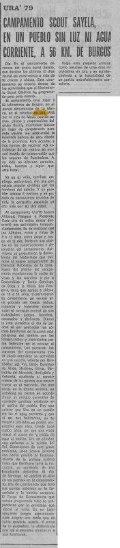 En julio de 1979 el grupo Scout Sayela celebró su campamento de verano en el término de Ura, en el paraje de "La Merca". La crónica describe un pueblo con apenas seis vecinos permanentes y sin suministro eléctrico ni agua corriente. El texto señalaba: El campamento tuvo lugar a 56 kilómetros de Burgos, en el paraje denominado de La Merca, en el término de Ura. Allá por el mes de Mayo, cuando padres, chicos y responsables del grupo Sayela intentaban buscar un lugar de campamento para este verano les sorprendió la inusitada belleza de este rincón de la provincia. Para acceder a Ura hemos de recorrer 4,5 kilómetros de un camino en muy mal estado de conservación que les separan de Puentedura. A su lado se alternan cereales, viñedos, huertas y algún que otro frutal. Ya en el valle, tomillos, espliego, malvavisco, dan una pincelada popular olvidada por los hombres del asfalto. Y un pueblo: apenas 6 vecinos y un puñado de veraneantes atraídos de toda la geografía española un año más por su Ura natal. Hay que aclarar que Ura es un pueblo sin luz ni agua corriente y que al ser sus habitantes, en su mayoría jubilados no podían emprender esta obra. Desde hace cuatro años, en que una riada anegó el cauce de la traída de agua al molino, Ura se alumbra con carburo a la puesta del Sol. Conscientes de este grave problema, unos brazos jóvenes han hecho posible el funcionamiento de la antigua turbina hasta que Iberduero tome la iniciativa, ya aprobada, de una instalación definitiva. https://prensahistorica.mcu.es/es/catalogo_imagenes/grupo.do?path=1000460836&posicion=7&presentacion=pagina Diario de Burgos : de avisos y noticias: Año LXXXVIII Número 57270 - 1979 agosto 1