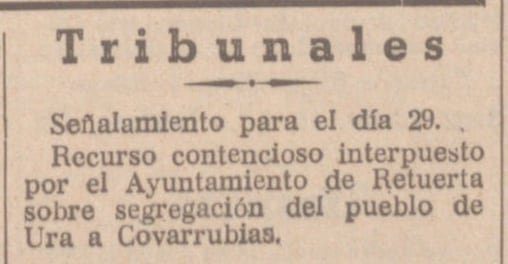 El castellano : diario independiente.: Año XXXV Número 10461 _ 28/09/1934 https://prensahistorica.mcu.es/es/catalogo_imagenes/grupo.do?path=198183&posicion=1&presentacion=pagina <u>ANOTACIÓN</u> Aunque el recorte es breve, por el encabezado y el contexto se deduce que en 1934 todavía existía malestar o protesta en Retuerta relacionada con aquella segregación. Esto sugiere que la cuestión no fue pacífica ni olvidada rápidamente. Es posible que hubiese tensiones económicas (pérdida de contribuyentes, montes comunales, aprovechamientos, etc.).