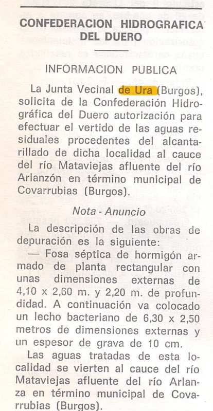 Siendo alcalde Marcelino Camarero. En la excavación de las zanjas surgieron huesos humanos en numerosos puntos del pueblo. El manantial de la Fontanilla (ladera del Castillo) se cerró con una caseta para llevar mediante tubería subterránea ese agua hasta el depósito. Pliego de condiciones para la contratación de las obras de abastecimiento, distribución y saneamiento de aguas en Ura. Importe: 9.994.281 pesetas Boletín oficial de la provincia de Burgos: Número 135 - 17 junio 1986 https://bibliotecadigital.jcyl.es/es/catalogo_imagenes/grupo.do?path=10639544&idImagen=105359583&idBusqueda=17602&posicion=8&presentacion=pagina