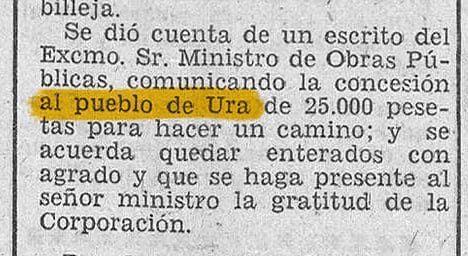 La Diputación Provincial de Burgos concede una subvención de 5.000 pesetas al pueblo de Ura para las obras de ensanche de una parte del camino que une dicho pueblo con el de Puentedura.