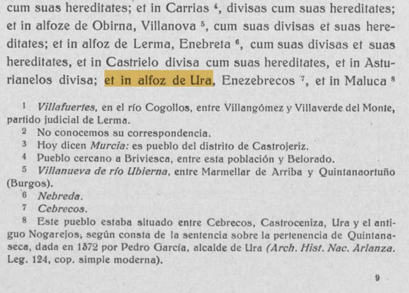 Entre ellas aparece una referencia directa al territorio de Ura con la fórmula latina: “et in alfoz de Ura, Enezebrecos, et in Maluca suas divisas cum suas hereditates”. Con esta expresión se indicaba la existencia de posesiones situadas dentro del alfoz de Ura, concretamente en los lugares denominados Enezebrecos y Maluca, cuyos límites y heredades quedaban también incluidos en la donación.