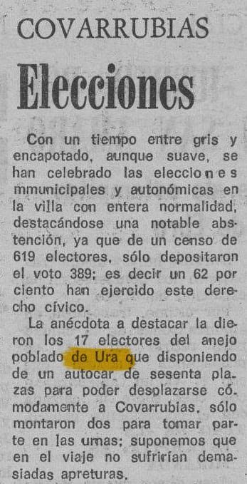 En las elecciones municipales y autonómicas de 1983, el anejo de Ura contaba con 17 electores censados. Solo dos vecinos utilizaron el autobús habilitado para desplazarse a Covarrubias a votar.