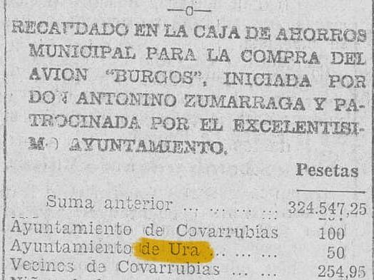 Recaudado en la Caja de Ahorros Municipal para la compra del avión "Burgos" [...]: Ayuntamiento de Ura, 50 pesetas.