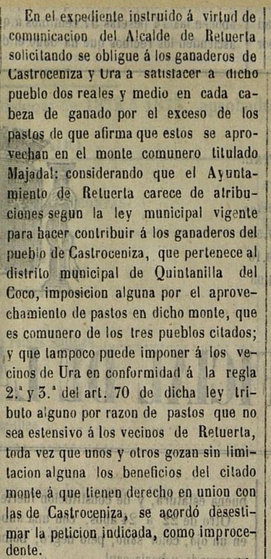 El consejo real ha celebrado audiencia pública el día 11 [...] decidiendo el negocio seguido entre los ayuntamientos de Castroceniza y los de Retuerta y Ura sobre subsistencia o revocación [...] del monte que disfrutaban comunalmente