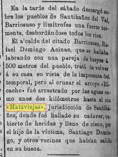 Días pasados resultó afectada la zona de Santo Domingo de Silos y ya dimos cuenta de los daños causados por el rio "Mataviejas" que a causa de la violenta tromba de agua recibida se salió de madre y produjo grandes destrozos. Este mismo rio se desbordó en el término del pueblecito de Ura, próximo a Covarrubias, el cual resulto inundado y con varias tierras anegadas, por lo que se perdieron muchas mieses y otros enseres. •Las pérdidas se evaluan en la respetables cifra de 150.000 pesetas. Diario de Burgos : de avisos y noticias: Año LXII Número 19066 - 1952 julio 25 https://prensahistorica.mcu.es/es/catalogo_imagenes/grupo.do?path=1000452542&posicion=3&presentacion=pagina Adjunto un recorte de Diario de Burgos sobre la misma tormenta donde informa del hundimiento de un puente en Santibañez del Val, de dos tenadas y de la presa de un molino en las márgenes del Mataviejas. Al modo de una DANA.