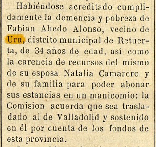 Teniendo en cuenta que la edad media de los habitantes será entre los 60 y 65 años, que no existe carretera, que no existe teléfono, que durante la mayor parte del año el único medio de transporte que existe en el pueblo es un tractor, ¿no piensan señores que a estos vecinos les están negando lo más esencial que es vivir? y si lo que ocurrió en Castroceniza hubiera ocurrido en Ura, señores autoridades, ¿quién se habría salvado? ¿Quién les habría socorrido?. Finalmente como burgalés que soy, quiero decir a las autoridades provinciales y regionales, que me da vergüenza que «Vds.», sigan dando premios de embellecimiento a unos pueblos, mientras existan pueblos como Ura, en el que sus vecinos «pagan» religiosamente los impuestos todos los años. Yo me pregunto y pregunto si ese pueblo habría sido tratado igual si alguno de sus hijos hubiese sido Abad o político.