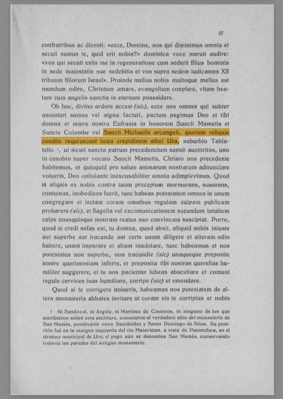 Por lo cual, inflamados por ardor divino, he aquí que todos nosotros, los que abajo suscribimos o hacemos nuestras señales, establecemos un pacto con Dios y contigo, señora y madre nuestra Eufrasia, en honor de San Mamés, de Santa Columba y también de San Miguel, cuyas reliquias, depositadas, reposan junto a la orilla del cauce de Ura, en el suburbio de Tabladello; y, siguiendo la autoridad de los santos padres, hemos constituido un único cenobio bajo la advocación de San Mamés, teniendo a Cristo por guía; y todo lo que queramos ofrecer por la salvación de nuestras almas, con la ayuda de Dios, nos comprometemos a cumplirlo sin excusa.