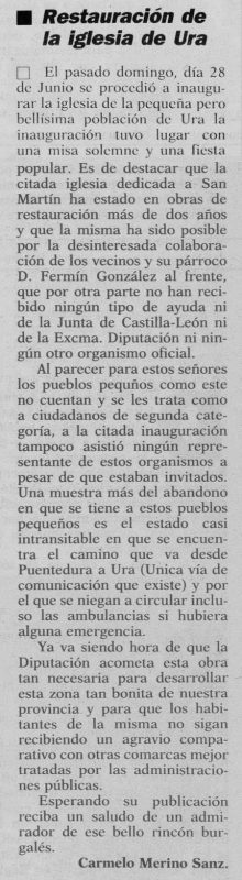 El 12 de julio de 1992 el Diario de Burgos publicó en su sección “Cartas al director” un escrito firmado por Carmelo Merino Sanz sobre la reciente inauguración de la iglesia de Ura. En la carta se indicaba que el templo, dedicado a San Martín, había permanecido más de dos años en obras de restauración, ejecutadas gracias a la colaboración de los vecinos y del párroco D. Fermín González, sin ayudas de la Junta de Castilla y León ni de la Diputación. El firmante también denunciaba el estado “casi intransitable” del camino desde Puentedura, señalando que incluso ambulancias evitaban circular por él. La carta constituye un testimonio vecinal sobre la situación infraestructural y el sentimiento de abandono institucional en los primeros años noventa.
