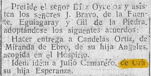 La Comisión Gestora de la Diputación Provincial acuerda hacer entrega a Julio Camarero, de Ura, de su hija Esperanza acogida en el Hospicio.